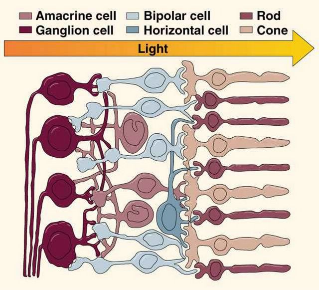 The immediate process of judging a colour begins in the retina, which has three layers of cells. Signals from the red and green cones in the first layer are compared by specialized red-green “opponent” cells in the second layer. These opponent cells compute the balance between red and green light coming from a particular part of the visual field. Other opponent cells then compare signals from blue cones with the combined signals from red and green cones.